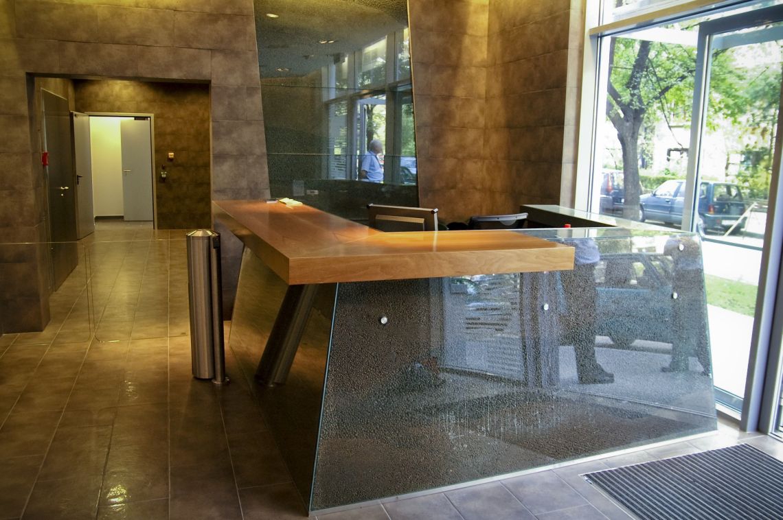 Furniture parts as insert glasses using SichOr® tempered glass or Emalor® Design with tempered glass. Tempered glass with sandblasted surface or decor with sandblasting.
