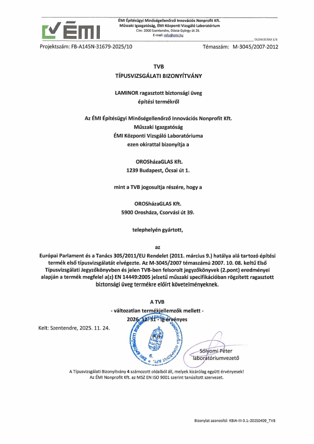 LAMINOR  ÉMI TIPUSVIZSGÁLATI BIZONYÍTVÁNY